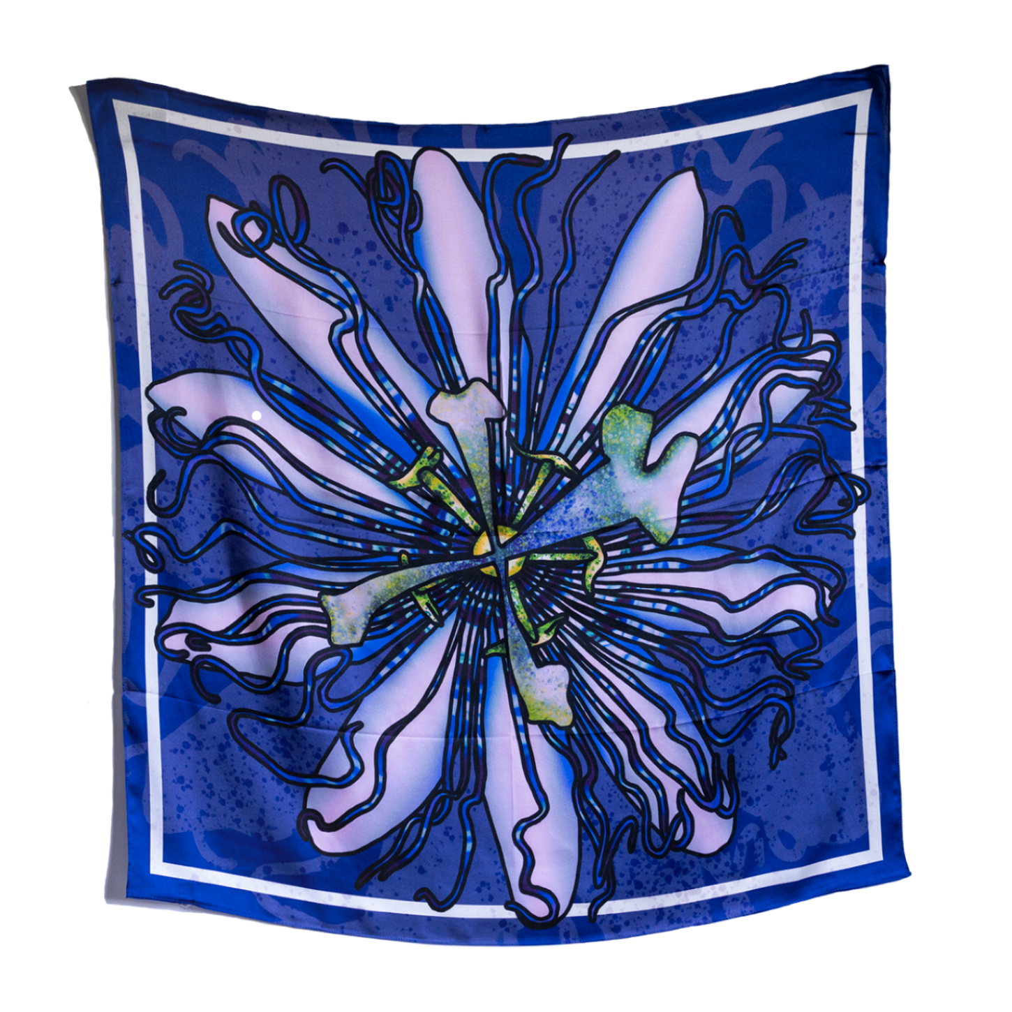 The Passa Flora "Blue Diva" scarf is for the bold baddies! Period. The passion flower design gives this scarf a bizarre flair, perfect for adding a pop to your look. It can be worn around the neck, head, or in any way your vision guides.