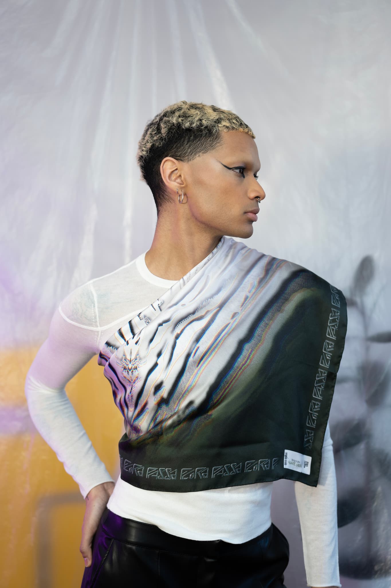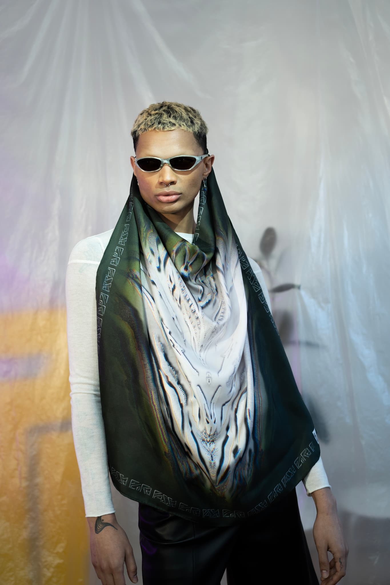 A limited-edition silk scarf exploring color, depth, and adornment. Designed by artist Passa Harrison as part of an ongoing practice centered on transformation.